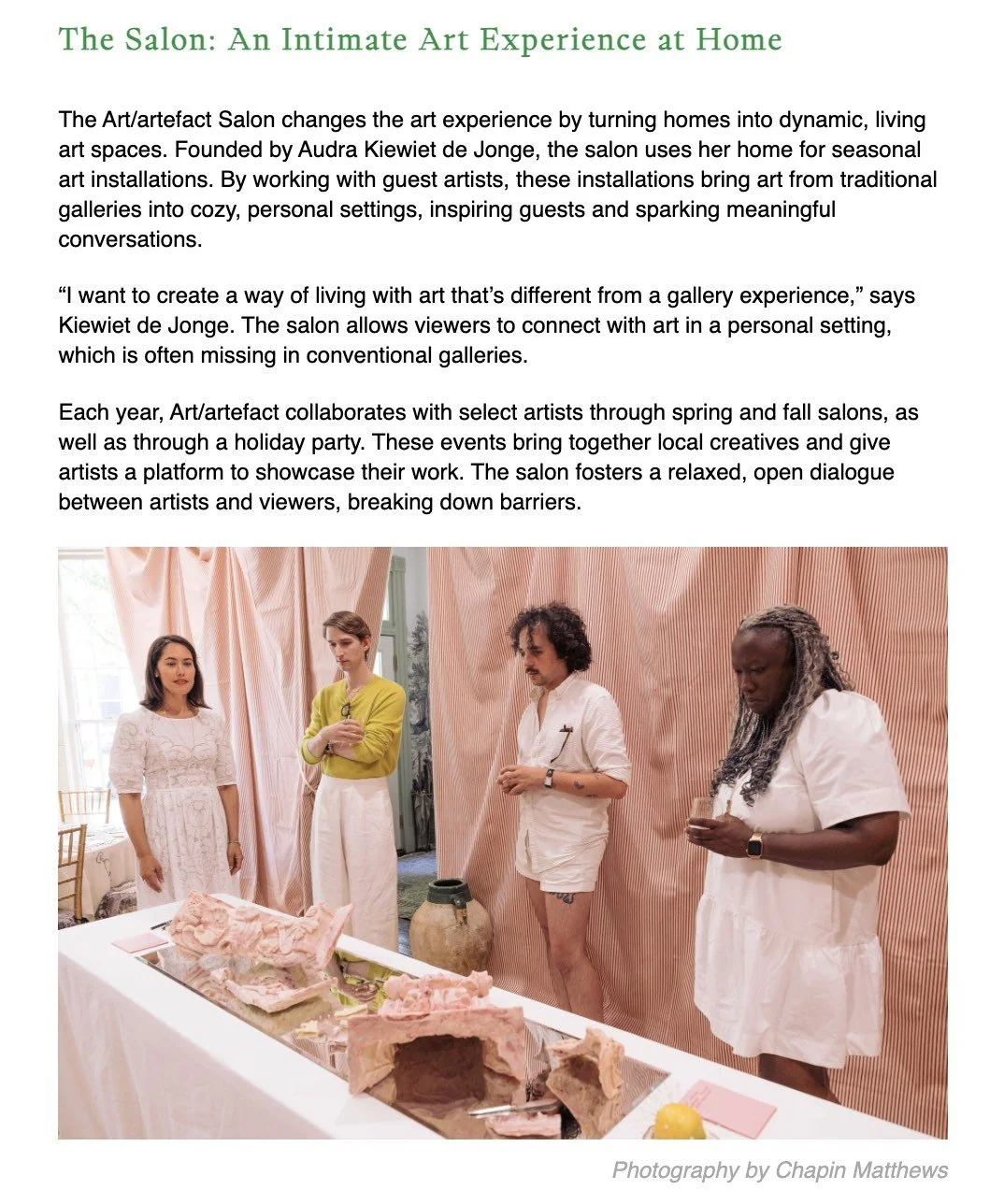 “Step inside Audra Kiewiet de Jonge‘s home and travel to a world of decadent aesthetics and exquisite collections that suddenly feel approachable and attainable – as the Art/artefact Salon transforms her residence into a vibrant space featuring intimate installations that bring art into everyday life.”